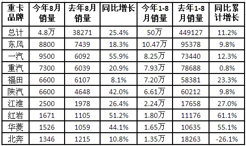 这其中,前五名的当月销量相对比较接近,东风、一汽、重汽、福田和陕汽8月份分别销售重卡8800辆(同比增长18.3%)、9500辆(同比增长55.9%)、7300辆(同比增长20.9%)、6600辆(同比增长8.1%)和6600辆(同比增长42.0%),五家中有四家的增幅都比较高,一汽和陕汽更是同比增幅超过40%;第三阵营也是一片飘红,江淮汽车8月份销售重卡2500辆,同比增长26.4%,上汽依维柯红岩和华菱星马分别销售重卡1671辆和1526辆,同比增幅为51.2%和44.1%;即使是销售业绩相对不太好的北奔,8月份也以1346辆的销量,同比增长了10.8%。